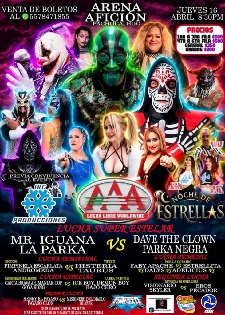 En la lucha super estelar, el carisma de Mr. Iguana y la leyenda de La Parka se enfrentarán a Dave The Clown y Parka Negra, en un combate que combina espectáculo, tradición y rivalidad.