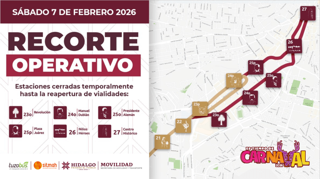 - La Secretaría de Movilidad y Transporte informó la implementación de un Plan Operativo y Logístico del Tuzobús con motivo del evento “Es Tiempo de Carnaval 2026”, que se realizará el próximo 7 de febrero en la ciudad de Pachuca de Soto, jornada que implicará ajustes en transporte, vialidades y actividades culturales.