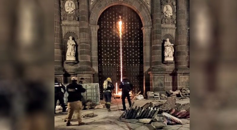 Medios locales y nacionales describieron el evento como un acto vandálico. Se estima que dos personas habrían saltado la reja, la del lado del Zócalo, rociado material combustible e iniciado el fuego en una de las puertas, y luego huyeron.