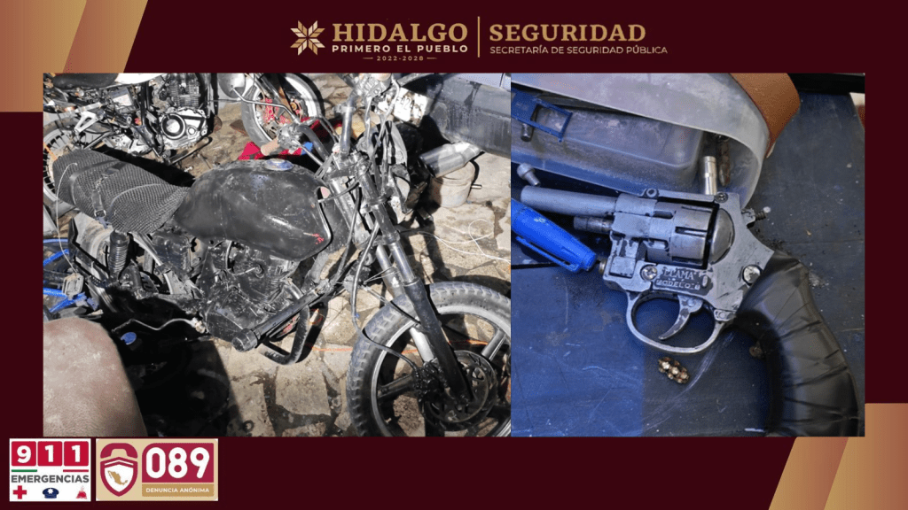 - La intervención, realizada en coordinación con la Procuraduría General de Justicia del Estado de Hidalgo (PGJEH) y la Secretaría de la Defensa Nacional (Sedena), permitió además el decomiso de un arma de fuego y diversos indicios vinculados con la posible venta de droga.