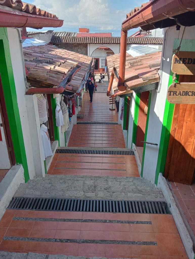 Este sitio está abierto con pasillos que llevan a cada uno de los locales por unas escalerillas y se distingue por el blanco de sus paredes y techumbre roja, como casi todo Cuetzalan.