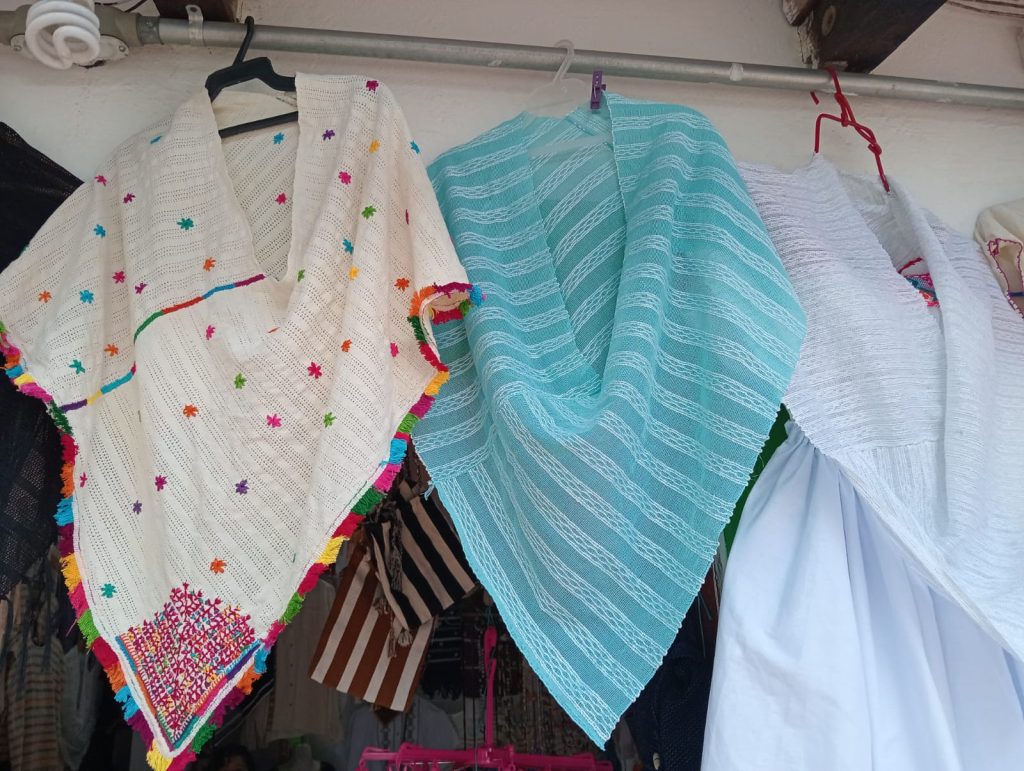 Ellas al mismo tiempo de que venden su trabajo, lo realizan en el sitio. Muestran ahí mismo el telar de cintura con tejidos o bordados de pepenado hilván en colores no muy fuertes, no tan llamativos, de verde, amarillo, azul, rojo, naranja.