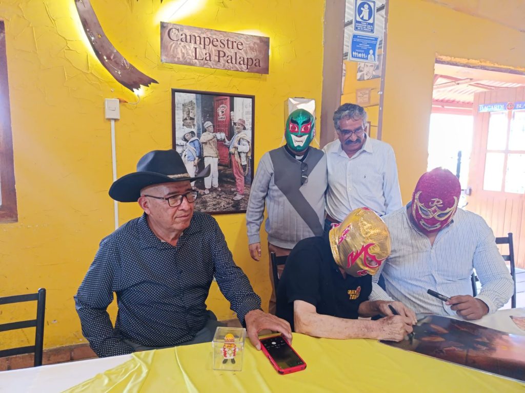 Junto él, en mesa lustrada con mantel blanco y sobremesa en tono amarillo, se flanquearon sus discípulos, ambos de la lucha libre: Antonio Martínez Sánchez, mejor conocido como El Chacal, y Fray Tormenta Jr., cuya identidad sigue en el anonimato debido a que no ha perdido la máscara en combate.