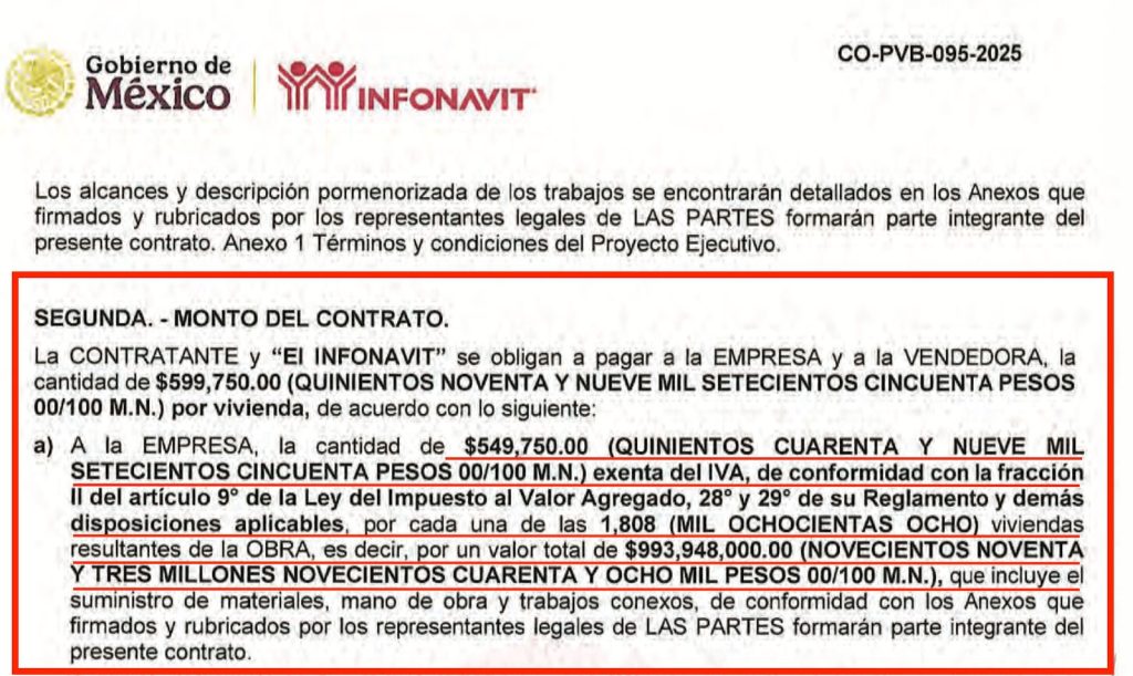 Además, según los registros de Infonavit, la otra empresa contratada es Constructora Dazna, representada por Carlos Eduardo Luna Mora, por un total de mil 55 millones de pesos para construir mil 920 casas en Tepeji; es decir, cada vivienda tendrá un precio promedio de 549 mil 999 pesos.