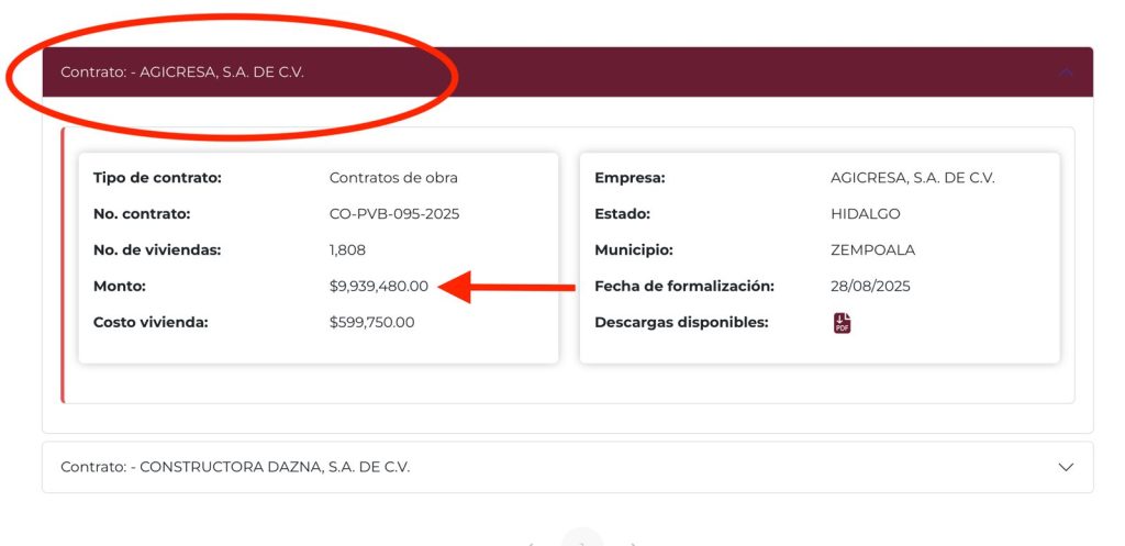 El Instituto del Fondo Nacional de la Vivienda para los Trabajadores (Infonavit) adjudicó la construcción de mil 808 casas en Zempoala a la firma Agicresa, representada por Arturo Crespo Arroyo, hermano del diputado federal, Ricardo Crespo Arroyo, por lo cual la constructora cobrará en total 993 millones de pesos; es decir, cada hogar tendrá un costo aproximado de 549 mil pesos, según el contrato.