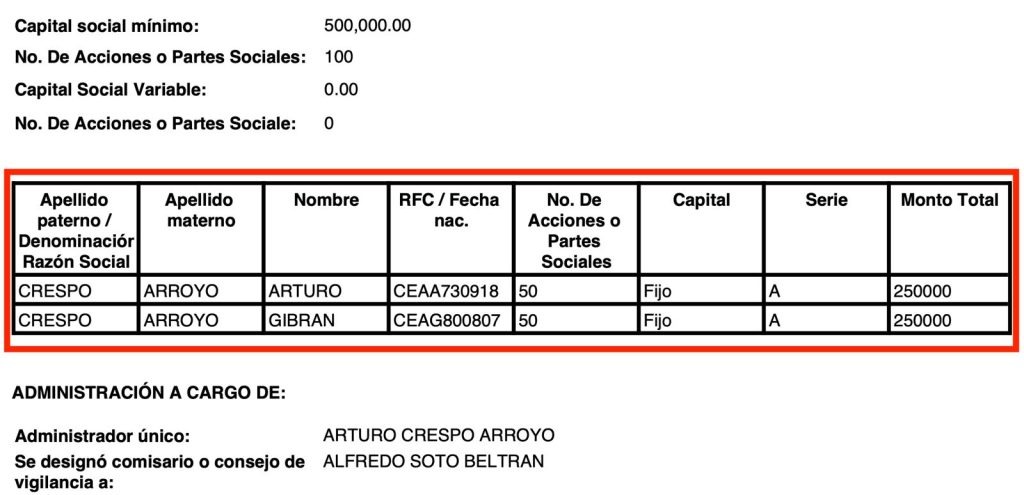 - El otro accionista de Agicresa, además de Arturo, es Gibrán Crespo Arroyo, de acuerdo con la constitución de la sociedad fechada en mayo de 2005 y que puede ser consultada en el Registro Público del Comercio, a la cual esta columna tuvo acceso.