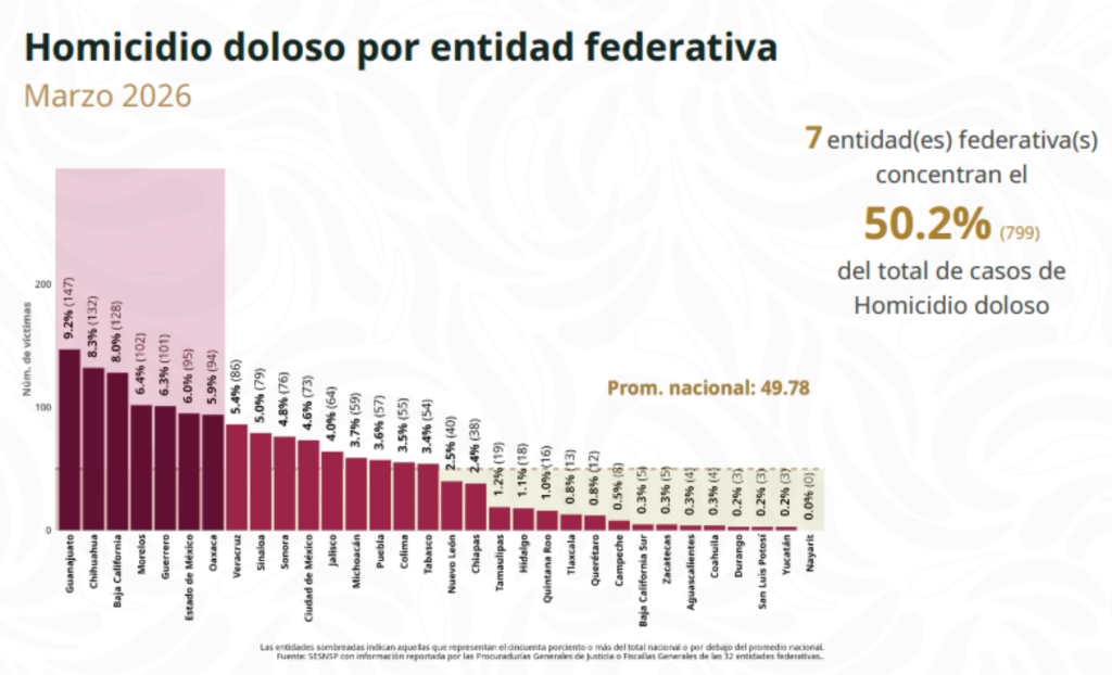 A nivel nacional, siete entidades concentran la mitad de los homicidios: Guanajuato, Chihuahua, Baja California, Guerrero, Estado de México y Oaxaca, territorios que continúan bajo presión por los niveles de violencia.