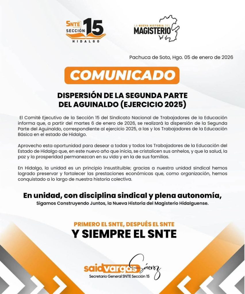 - Las y los Trabajadores de la Educación Básica en Hidalgo recibirán, a partir del martes 6 de enero de 2026, el segundo pago del aguinaldo, correspondiente al ejercicio fiscal 2025, informó la Sección 15 del Sindicato Nacional de Trabajadores de la Educación (SNTE).