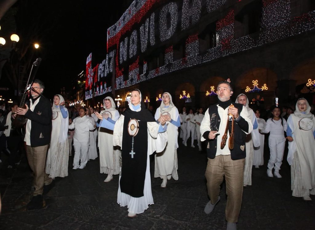 - El punto medular, sin duda, fue la procesión que se integró a la vida cotidiana del lugar y que marchó entre la decoración de luces navideñas que ya se observan en el Centro histórico de ésta entrañable ciudad.