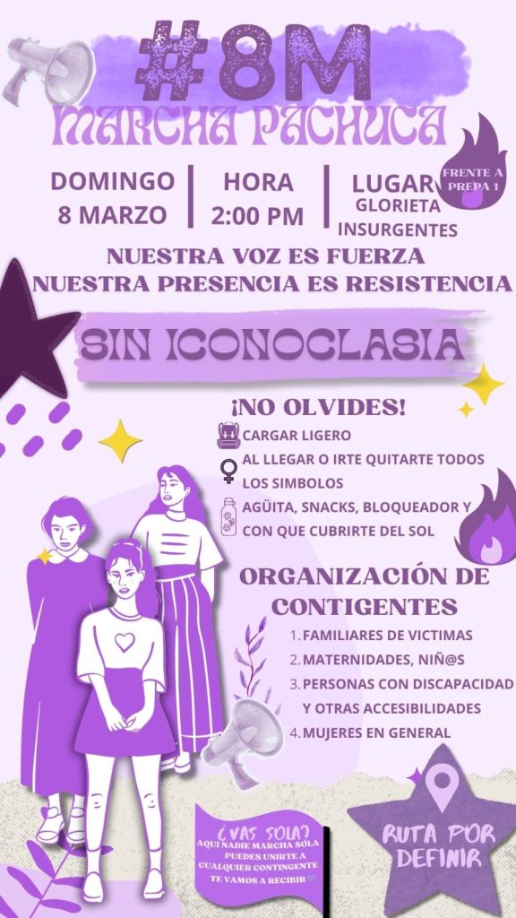 - En el marco del 8M, colectivas y participantes independientes convocan a la Marcha Pachuca, con punto de reunión a las 2.