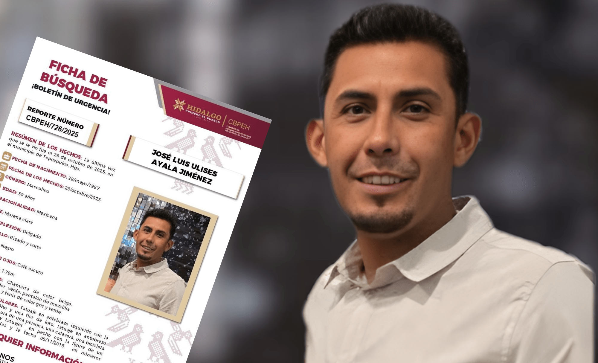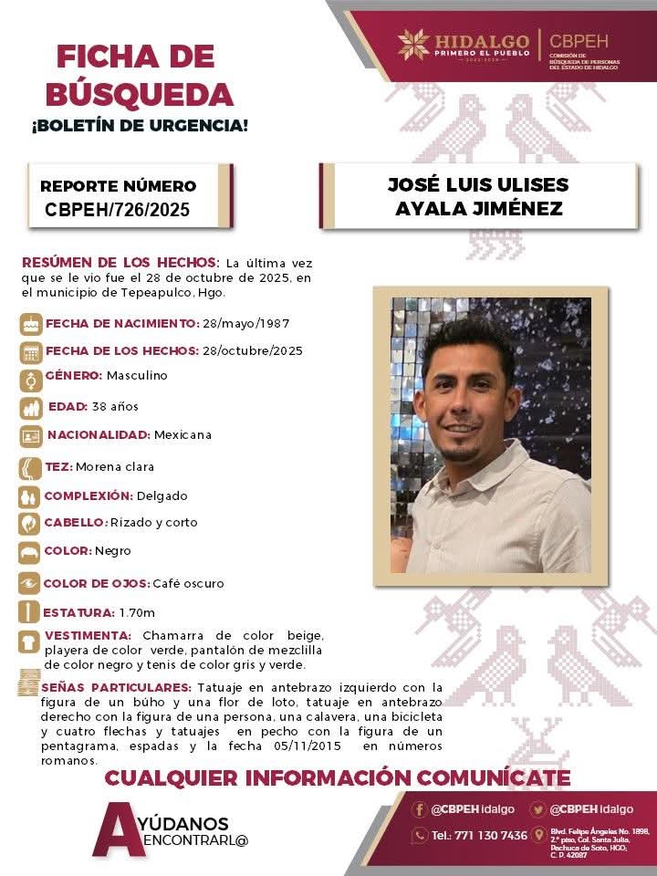 La Comisión de Búsqueda de Personas del Estado de Hidalgo (CBPEH) emitió un boletín de urgencia para localizar a José Luis Ulises Ayala Jiménez, visto por última vez el 28 de octubre de 2025 en el municipio de Tepeapulco, Hidalgo.