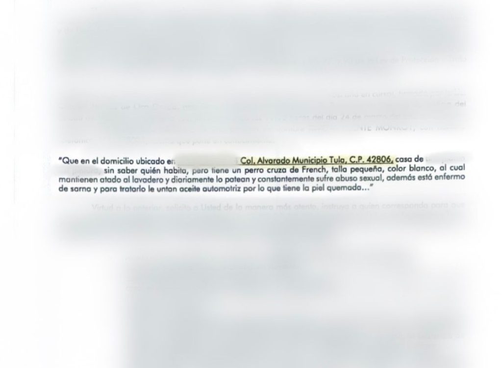 El señalamiento describía un escenario grave: un perro cruza de french poodle, de talla pequeña y color blanco, presuntamente mantenido atado, golpeado y víctima de abuso sexual, además de padecer sarna y recibir tratamientos inadecuados como aceite automotriz.