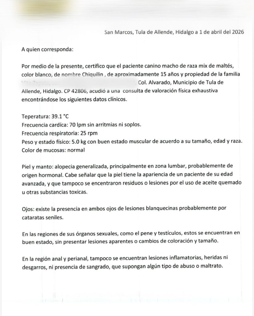 Sin embargo, tras una valoración física exhaustiva, el médico veterinario determinó que el canino, identificado como “Chiquilín”, de aproximadamente 15 años de edad, se encuentra en buen estado de salud general.