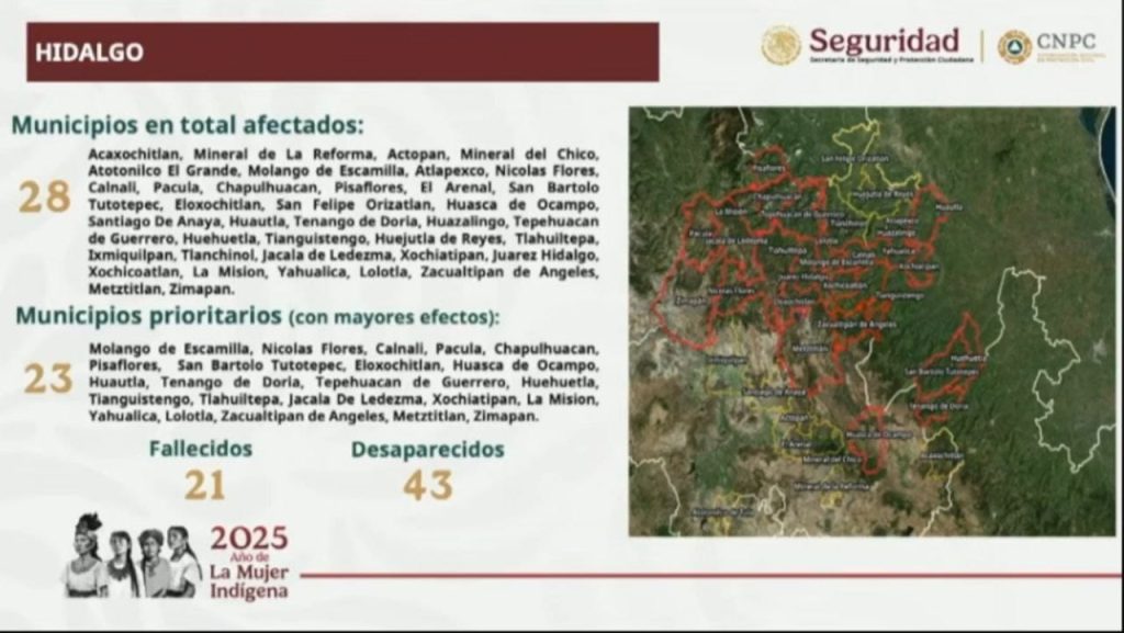 La coordinadora nacional de Protección Civil, Laura Velázquez, confirmó que Hidalgo es uno de los estados más afectados por las intensas lluvias registradas en octubre, junto con Veracruz, Querétaro, San Luis Potosí y Puebla. De acuerdo con el reporte oficial, 21 personas han muerto y 43 permanecen no localizadas en territorio hidalguense.