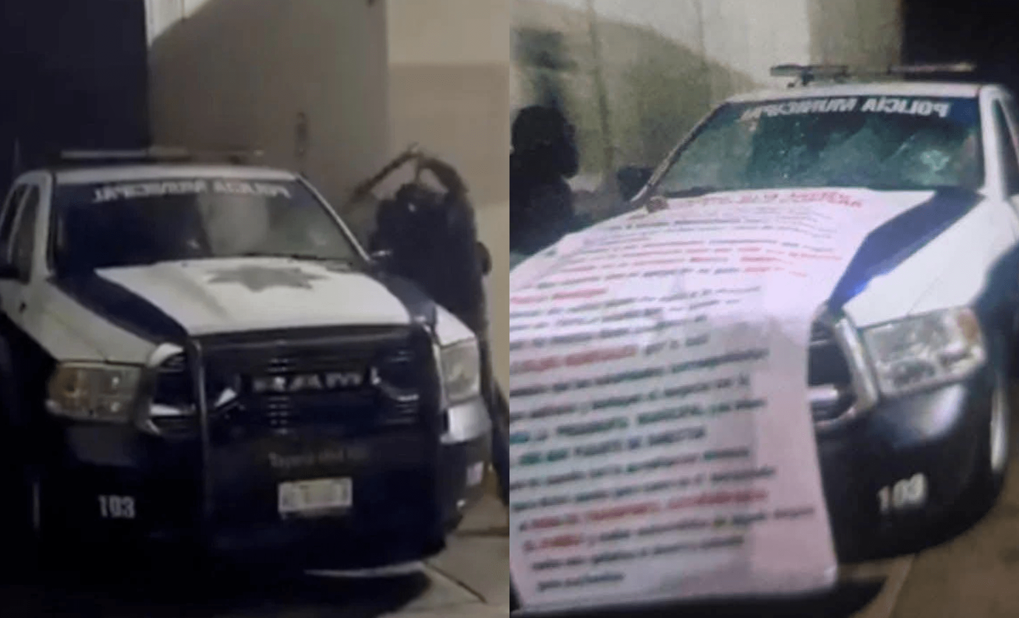 Con capuchas y armas de fuego, un grupo de hombres interceptó a un policía en Tepeji del Río, Hidalgo, el oficial fue golpeado y esposado a su patrulla; dejaron manta con mensaje a autoridades.